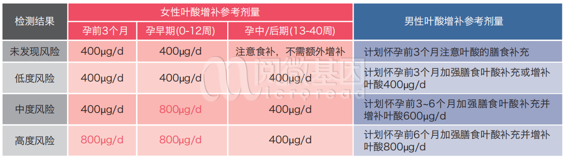 2008年中国疾病预防控制中心妇幼保健中心,把叶酸利用能力基因检测与风险评估列为临床应用指南,建议准妈妈在补充叶酸前进行叶酸利用能力基因检测,根据风险分级选择个性化的补充方案。此外,检测MTHFRMTRR基因多态性对高同型半胱氨酸血症患者补充叶酸,降低其脑卒中发生风险也具有一定的指导意义。